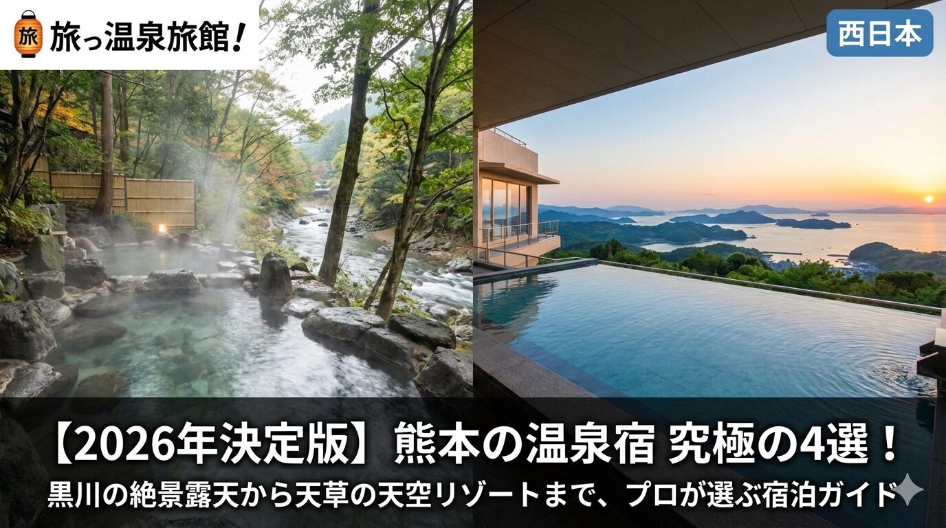 今回は、数ある熊本県の宿の中から、「森の露天」「天空の絶景」「隠れ家」「復興のシンボル」という4つの視点で厳選した、熊本で絶対に泊まるべき究極の温泉宿4軒をご紹介します。それぞれの宿の深掘り記事も合わせてチェックして、あなたの旅にぴったりの一軒を見つけてください。
