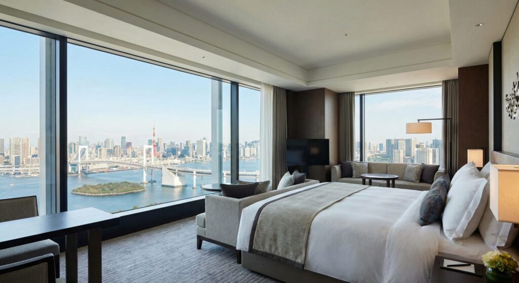 エントランスを抜けると、そこは開放感あふれるロビー。大きなガラス窓の向こうには、穏やかな運河と、対岸に広がる東京のスカイライン。チェックインを済ませ、エレベーターへ向かうその足取りは、これから始まる”天空の滞在”への期待で、自然と軽くなるはずです。ここは東京の中にありながら、東京の喧騒を離れ、東京を”眺める”ための場所。非日常のスイッチが入る瞬間です。