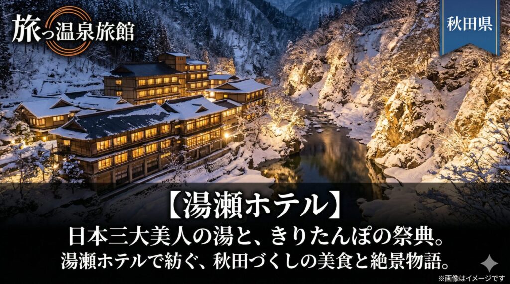 日本三大美人の湯と、きりたんぽの祭典。湯瀬ホテルで紡ぐ、秋田づくしの美食と絶景物語